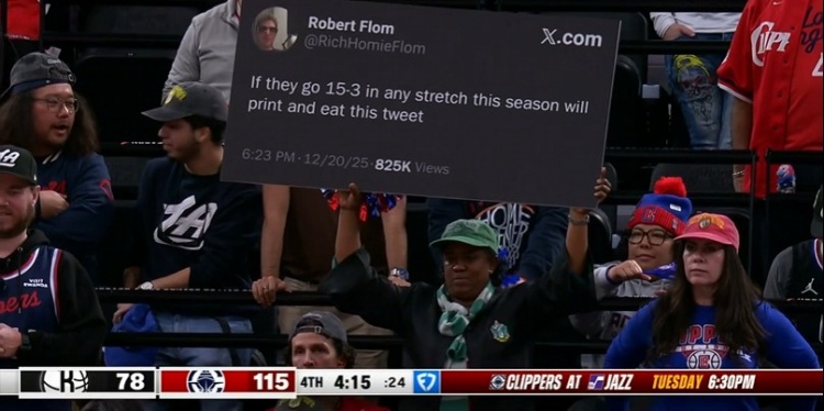 此前,一位网友曾表示,如果快船本赛季能够在任意阶段取得15胜3负,他将打印这条推文并吃掉,这段推文今天被展示在快船的球迷墙。