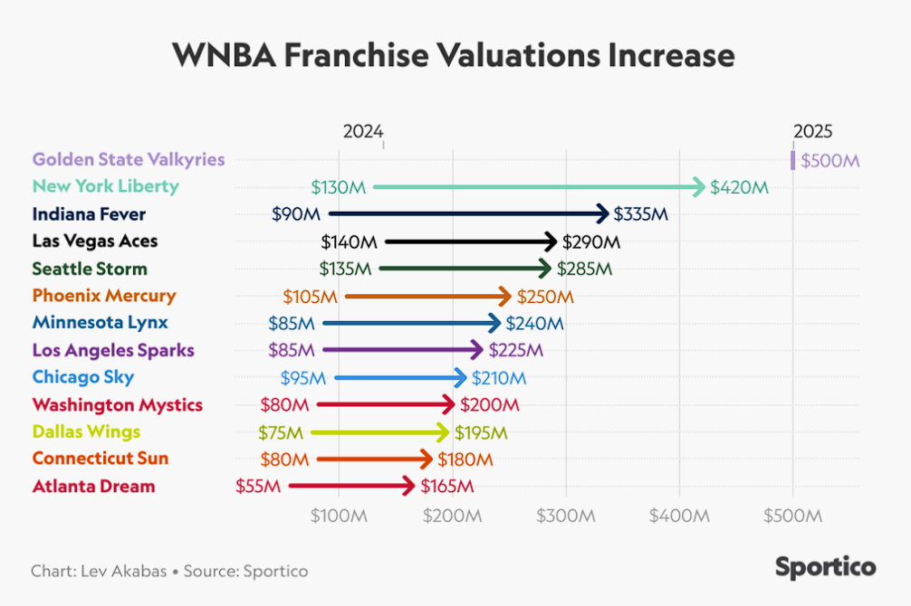 近两年,WNBA的商业估值全面上涨。据《Sportico》最新发布的榜单显示,2025年WNBA球队平均估值达1.3亿美元,较去年上涨180%。其中金州女武神高达5亿美元,一跃成为女子体育史上最值钱的俱乐部。