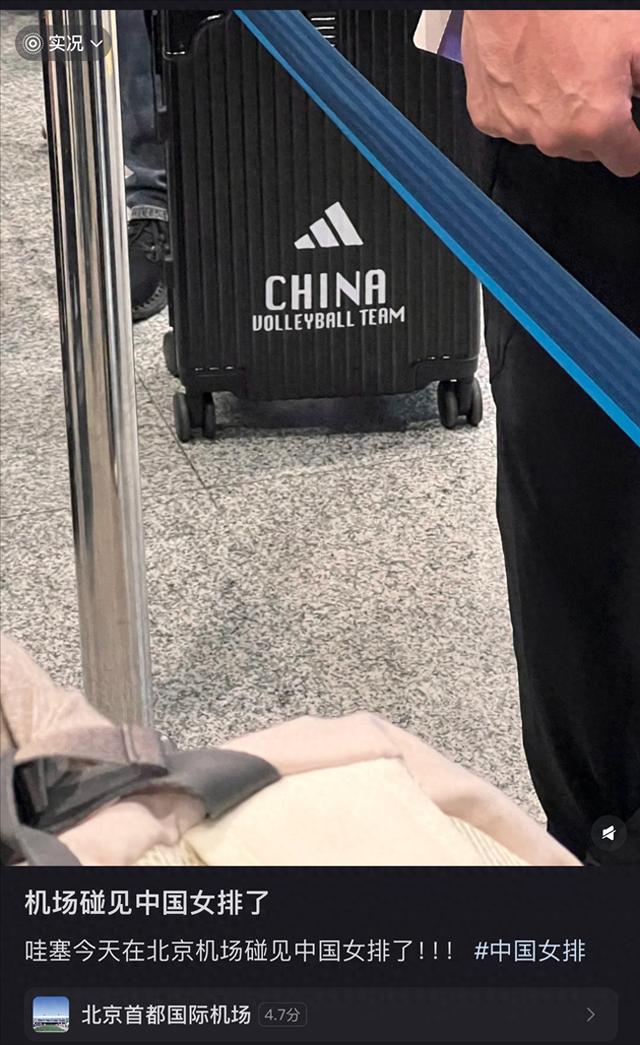 距离世联赛第三周开打还剩不到一周的时间,中国女排也终于完成休整,兵发美国。有球迷就在北京首都机场偶遇了前往美国阿灵顿参赛的女排姑娘们。虽然没有完整拍摄到球员,但写有“China Volleyball Team”的黑色行李箱格外显眼。